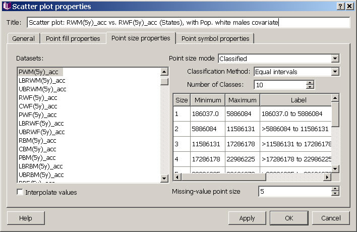 On the "Point size" tab of Scatter plot properties, you can change the size of the points in the plot. You can make all points on your map the same size (increasing or decreasing the size from the default), or can use point size as a way of providing additional information about your dataset, as in the example described here, and implemented in the image below. If you want to show points of different sizes, you need to first select a dataset for determining the size distribution (left side of dialog box), and then an appropriate size classification mode. Once the dataset has been divided into categories, you can left click in the boxes under "size" to edit the sizes assigned to each category of your grouped data. To see how changes will affect your plot without closing the dialog box, use the "Apply" button in the lower right.
