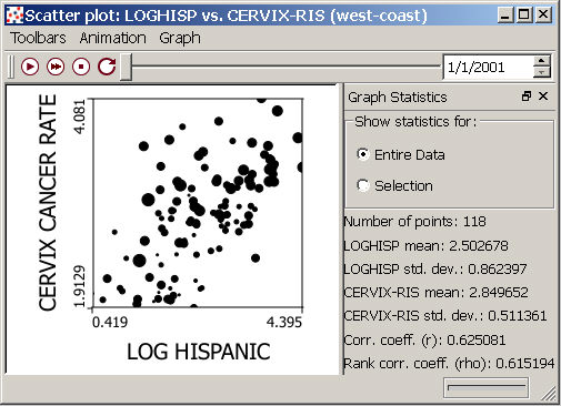 Like most views in SpaceStat, scatter plots for two datasets can be animated; use the animation toolbar to scroll through the temporal range of your data. You can also synchronize the animation in two dataset scatter plots with animation in other views, such as maps. Both types of scatter plot views are by default linked to other visualization tools, so that areas selected in one plot, map, or table, are also selected in other visible views. For example, you may wish to select locations where values of both datasets are particularly high, and see where those values occur on the map.