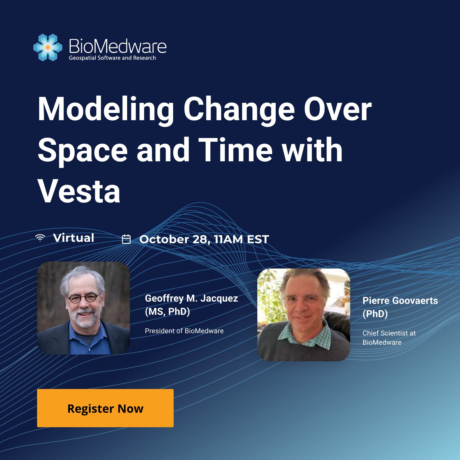 On October 28, join the BioMedware team for an exclusive webinar about modeling change over space and time with Vesta. As the only GIS platform that handles both temporal trends and spatial analysis, Vesta allows you to: