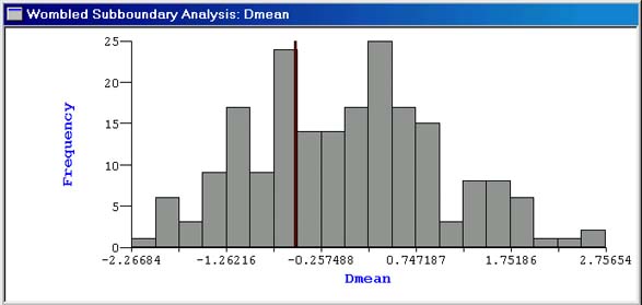 The figure below shows a reference distribution created for the mean subboundary diameter (Dmean) in a subboundary analysis. The red line on the graph shows the observed value for Dmean, and the gray bars show the reference distribution created from 200 randomizations. In this case, the observed value is not statistically unusual, being neither remarkably large (p = 0.711), nor remarkably small (p = 0.348).