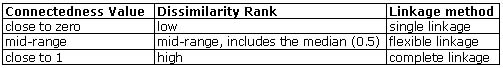 The connectedness parameter sets the type of flexible linkage clustering. Connectedness can be between but not include 0 and 1. BoundarySeer calculates the dissimilarity metric for all the locations in each of the two compared clusters and then sorts the list for each cluster. The connectedness parameter tells BoundarySeer where on the list of dissimilarity metrics to compare values.