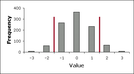 The upper and lower p-values provide a sense of how extreme the value is compared to the distribution. The histogram below shows a distribution of 1000 randomly generated numbers. The red lines approximately showing the top and bottom 5% of the distribution. Thus, they delineate the cutoff values for alpha = 0.05.