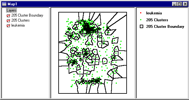 The map shows the 205 clusters in leukemia cases/1000 population. The red dots for the leukemia samples are completely obscured by the green cluster dataset dots. This is because a new dataset (205 Clusters) has been created with the same spatial coordinates. If you wish to view the original dataset, clear the 205 Clusters box in the layers pane of the map window.