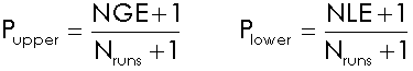 where Nruns is the total number of Monte Carlo simulations, NGE is the number of simulations for which the statistic was greater than or equal to the observed statistic, and NLE is the number of simulations for which the statistic was lower than or equal to the observed statistic. One (1) is added to the numerator and denominator because the observed statistic is included in the reference distribution.