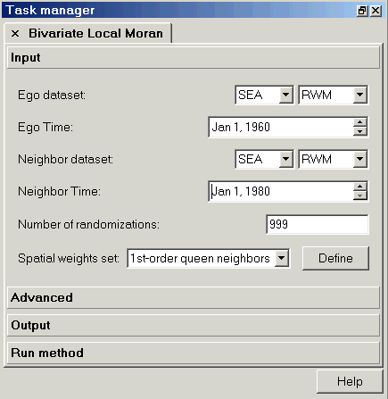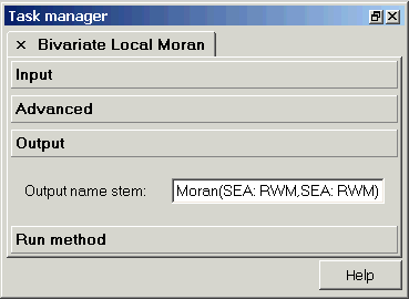 The output section of the task manager for the Bivariate Local Moran asks for a name stem to use for output files. The default name for analyses on the two times shown in the image of the input screen for the dataset "RWM" in the geography called "SEA" (State Economic Areas) is shown below.