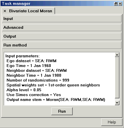The run method page presents a summary of the previous three pages so that you can review the choices you have selected. If everything here looks correct, select the "Run" button at the bottom of the page. The map output from this run is shown in the Interpreting Bivariate Local Moran Statistics pages; the run will also produce a Moran scatterplot.
