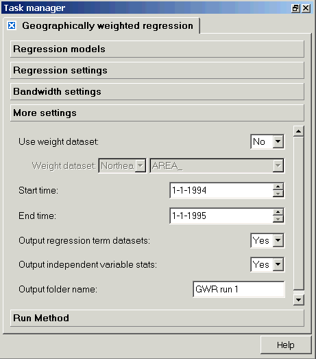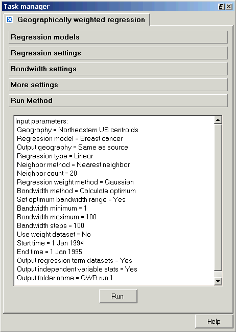 When you click on "Run Method", the task manager will present a summary of the model you have just created or modified. If you agree with the model definition that appears in this window, then click on the "Run" button at the bottom of the window to run the model. Note that the information shown here will be repeated in the log at the beginning of your GWR regression output.