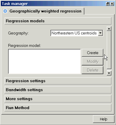 When the task manager opens for GWR, it will start on the "Regression models" section. Here, you must choose your geography (if your project contains more than one point coverage), and then indicate whether you would like to create, modify, or delete a regression model. You can create a suite of models that all share the same geography, dependent variable, and form (linear, Poisson, and logistic) within one Geographically weighted regression "tab" in the task manager, and these will all appear with the default name "Regression model" on this page, unless you change the name (see below). Note that any aspatial regression models that you have created using a point geography will also appear in this window. To modify an existing model, highlight it, and then hit the "Modify" button. Similarly, select a model and then click on delete to remove it from the list. Additional models can be created and saved, and they will all be listed in this window. Note that if you choose the regression method again from the methods pull down window, a new regression tab will appear, and will list the same suite of models (an example of this is shown here, for aspatial regression). You can delete this extra tab without losing your saved models.