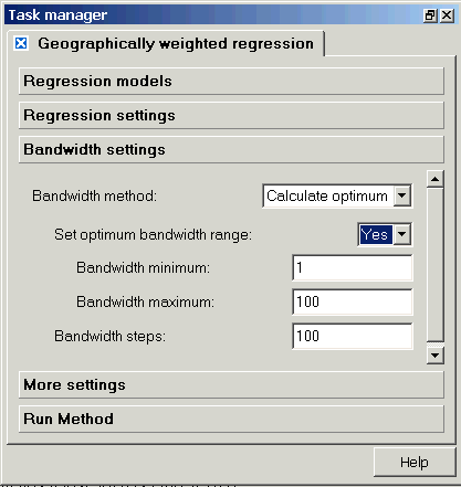If you choose a weighting scheme that requires a bandwidth, you will specify the bandwidth on the "bandwidth settings" page. This process is described in detail here. The default is for you to specify a bandwidth ("Specify" will be shown where it says "Calculate optimum" in the image below). The default value for the "Specify" option is the maximum distance between two points in your geography; similarly, the default ranges under the "Set optimum" option are the minimum and maximum distance between points. The calculate optimum method uses a cross-validation procedure, with the number of cross-validation calculations set by your entry for "bandwidth steps."