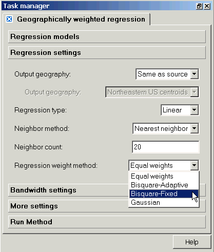Next, you will need to define the geographic weighting scheme that will be used in your analysis. This process includes two basic steps -- defining the neighbor method (nearest neighbor or distance range, abbreviated as range in the pull down menu), and defining the regression weight method (the options are shown in the image below, to the right of "Regression weight method"). If you choose to use a range rather than a nearest neighbor approach for defining neighbors, the box marked "neighbor count" in the image below will instead ask for "Range". Here you can accept the default of 10, or enter a new distance value (in the same units as the coordinates for your centroid geography). The Gaussian and Bisquare-Fixed options will require a bandwidth, which you will specify (or have SpaceStat optimize) on the bandwidth settings tab.