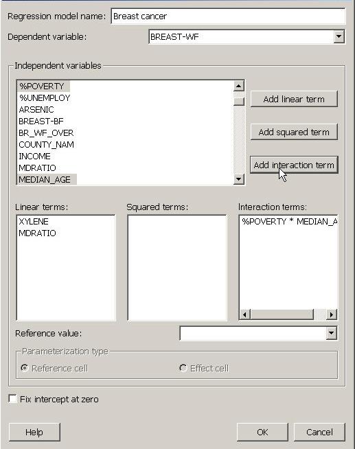 The window titled "Independent variables" lists all of the datasets associated with the geography that you selected in the first task manager window for regression. To use one or more of these datasets as a term in your model, click on it to select it. To select more than one dataset (as shown in the image above, for adding an interaction term), hold down the "Ctrl" button as you click on each. When the dataset name is selected, you can then use the buttons on the right to add that dataset as a linear term (i.e., as an "x"), as a squared term (i.e., as an x2), or as part of an interaction term in which it will be multiplied by one or more other independent variables. In the example above, we have selected the two linear terms (XYLENE, and MDRATIO), and included an interaction term (%POVERTY * MEDIAN_AGE). As you add various terms, they will appear in the three boxes in the center of the task manager window. You can delete terms that you have created by selecting them and then using the delete button on your keyboard.