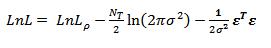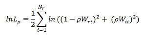where the first two terms denote the normalization contributions that depend on the trace of the logs of the weight matrices and the last term (corresponding to a sum of squares) contains mixtures of residuals, weight matrices and regression coefficients e = Ay - Xb with the lag term written A = 1 - rW1.