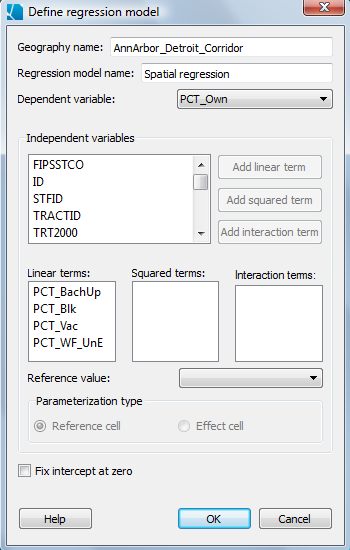 Directly below the windows where the regression model terms are listed is a section that only applies to categorical variables; in this area you will choose a reference value and a parameterization type (coding system). These options are explained in detail in the help section on categorical data in regression. To fill in these options for your categorical variables, first select the categorical dataset. When a categorical dataset is selected, you will be able to scroll through the names of the categories within that set in the box to the left of "Reference value for...". Next, for that same categorical dataset, you choose a reference cell or effect cell approach to coding by clicking on the respective circle to the left of your choice. If you have more than one categorical term, including interaction terms that incorporate a categorical dataset, you will need to repeat this process for all of these terms. If you forget to do this step, SpaceStat will run the model using the default settings of the final category as the reference value, with the reference cell parameterization type.