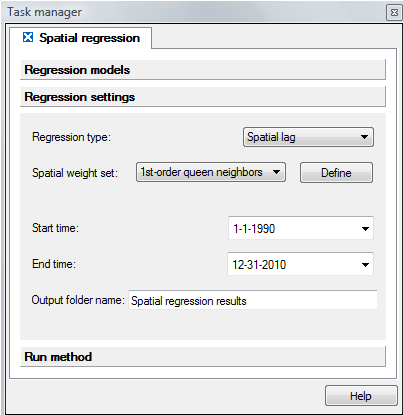 After you have identified the datasets to be used in your model, you will need to define further settings in the Regression settings tab. Here you will choose the type of spatial regression you would like to use: Ordinary Least Squares, Spatial Lag, or Spatial Error. You will also define a spatial weight set in this tab, along with the time settings, and an output folder name.
