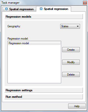 When the Task manager opens for Spatial regression, it will start on the Regression models tab. Here, you must choose your geography (if your project contains more than one), and then indicate whether you would like to create, modify, or delete a regression model. You can create a suite of models that all share the same geography and datasets within one Spatial regression tab in the task manager, and these will all appear with the default name Regression model on this page, unless you change the name.