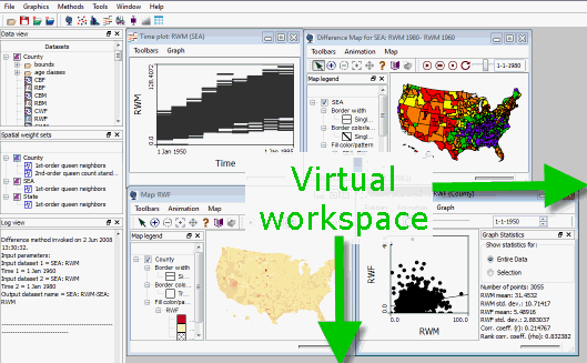 Because dynamic data exploration is quite graphical, you may want to keep several windows open to display multiple views of the data. However, this often means that one or more windows are not visible, either because they are too small to see (when many windows are tiled), or because some are underneath others (as when you use the cascade option). SpaceStat allows you to turn on a "virtual workspace" so that you can arrange many windows, and then use scroll bars on the workspace (the area surrounded by the data view, spatial weights view, and log) to move through all of the information.