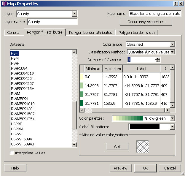 By checking the box in the lower left (below the list of datasets), you can choose to have SpaceStat interpolate values during animations or map movies to smooth the transitions between different fill types if an object's fill class changes over time.