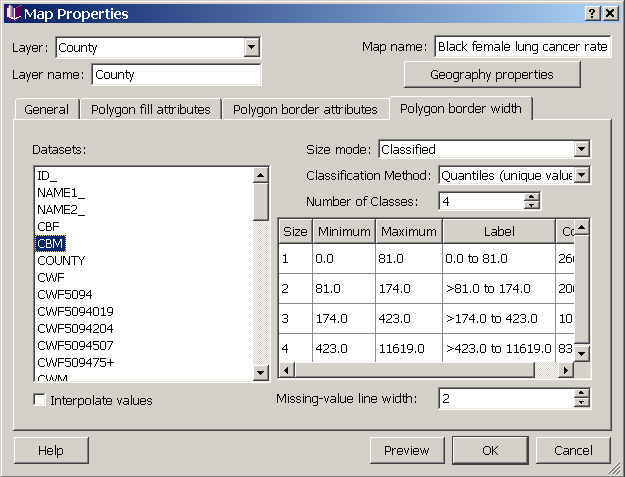 If you choose border widths that vary in time, you can check the interpolate values box (lower left corner) to smooth the transitions between border widths in an animation or map movie. Also, you can chose specific polygon border width characteristics for objects with missing values in the lower right corner.