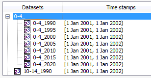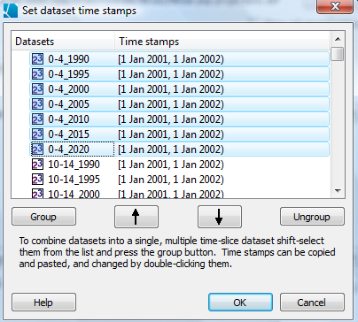 You will see that there are groups of similarly named datasets in the file, as shown below. All of the highlighted datasets (beginning with "0-4_") belong together. They're a group of estimates for the same age class, 0-4 years of age. The date of the estimate is in the suffix of the dataset name (values from 1990 to 2020 in 5 year intervals). So, to create a single space-time dataset from the pieces, highlight a set with the same prefix and click on the group button.